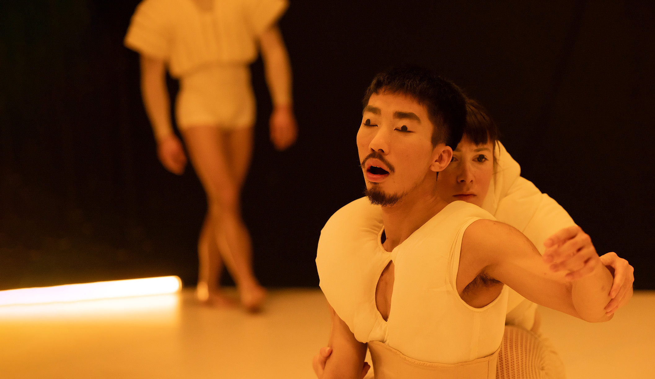 Who is observing whom here? And which perspective is the correct one? On this evening, the stage is a square dance floor in the middle of the room, surrounded on all sides by the audience. One rarely gets this close to the dancers, but is also rarely so vulnerably exposed to their probing gazes. The evening includes two world premieres: In Felix Landerer's The Arrangement, five individuals strive for coexistence in a confined space, alternately fighting around and against each other. The conclusion: However difficult life together may be, alone it is entirely impossible. French choreographer Marion Zurbach also explores interpersonal relationships in Coproduced by. Eight mysterious, doll-like beings constantly re-examine their relationships and seem to reassure themselves of their humanity ...