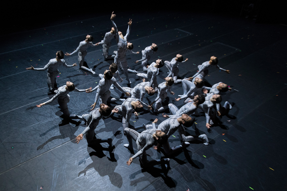 Montero greift diese Szene auf, gestaltet sie zum wohl stärksten Bild im letzten Drittel seines nur 85-minütigen und dennoch in seiner gewichtigen Vielfalt abendfüllenden Stücks. Ein Tänzer, Oscar Alonso, eine der denkbaren Dürer-Verkörperungen, streift sein dunkelgraues Trikot ab zugunsten eines weißen, mit schwarzen Linien markierten. Die Häutung macht deutlich, wie genau Dürer einst Körper segmentierte, um sie naturgetreu und doch in fantastischer ästhetischer Überhöhung ätzen, zeichnen oder malen zu können. Eine Frau, Rachelle Scott, bis dato madonnenhaft in ein blaues Tuch verhüllt, wirft dieses ab und steht nun da in einem ebenfalls schwarzweiß gemusterten Ganzkörperstrumpf, Schulter an Schulter mit Alonso, nur seitenverkehrt. So dass sie beide, janusköpfig voneinander abgewandt, aussehen wie die zwei gegenläufigen, mobilen Hälften eines einzigen Körpers – Yin und Yang. Und dabei signalisieren ihre Körper wie auch ihre Trikots, worauf Goyo Montero, Albrecht Dürer folgend, sich in seinem Tanzstück konzentriert: auf die Schönheit des Körpers, wie sie der bildende Künstler durch Raster zu erforschen suchte, um sie dann akribisch nachzubilden. Alonso und Scott umkreisen einander auf leerer Bühne wie zwei ferne Planeten. Auf der linken Bühnenhälfte steht das Corps de ballet im Halbprofil mit dem Rücken zum Publikum. Es ist auf dem Quivive, um mit dem Einsatz der Geige beim stürmischen «Winter» von Antonio Vivaldis «Vier Jahreszeiten» loszuwirbeln wie ein vielgestaltiger furioser Spiralnebel in diffusem Licht. Genauso abrupt, wie die Gruppe losstürmt, erstarrt sie in loser Reihe an der Rampe und starrt ins Publikum. Sie schaut dabei nicht ganz so frech wie das Hündchen in der «Geißelung», aber doch provozierend genug, sodass man sich für den Bruchteil einer Sekunde in der Rolle des passiv konsumierenden Zuschauers unwohl fühlt. Dürers Hund, so viel ist nun endgültig klar, schwebt in «Dürer’s Dog» nur als Idee über allem. Und was nun die Bildmotivik angeht, so sieht man an einer Stelle, in den Spektralfarben Blau, Rot und Grün längs gerastert, eine Tänzer-Reihe mit einem wild springenden Narren vorn dran und weiß, dass es sich dabei nur um ein bewegtes Replikat von Dürers breitgefiedertem «Blaurackenflügel» handeln kann. Goyo Montero also setzt starken Bildern starke, verfremdete Bilder entgegen, auch akustisch nochmals verstärkt von einer klangmächtigen, von der Staatsphilharmonie Nürnberg unter Guido Johannes Rumstadt dynamisch musizierten Musikmischung: raumfüllend Elektronisches von Owen Belton, Max Richters dramatisch verstärkte Bearbeitung von Vivaldis «Vier Jahreszeiten», Pendereckis «Passacaglia» aus der dritten Symphonie.