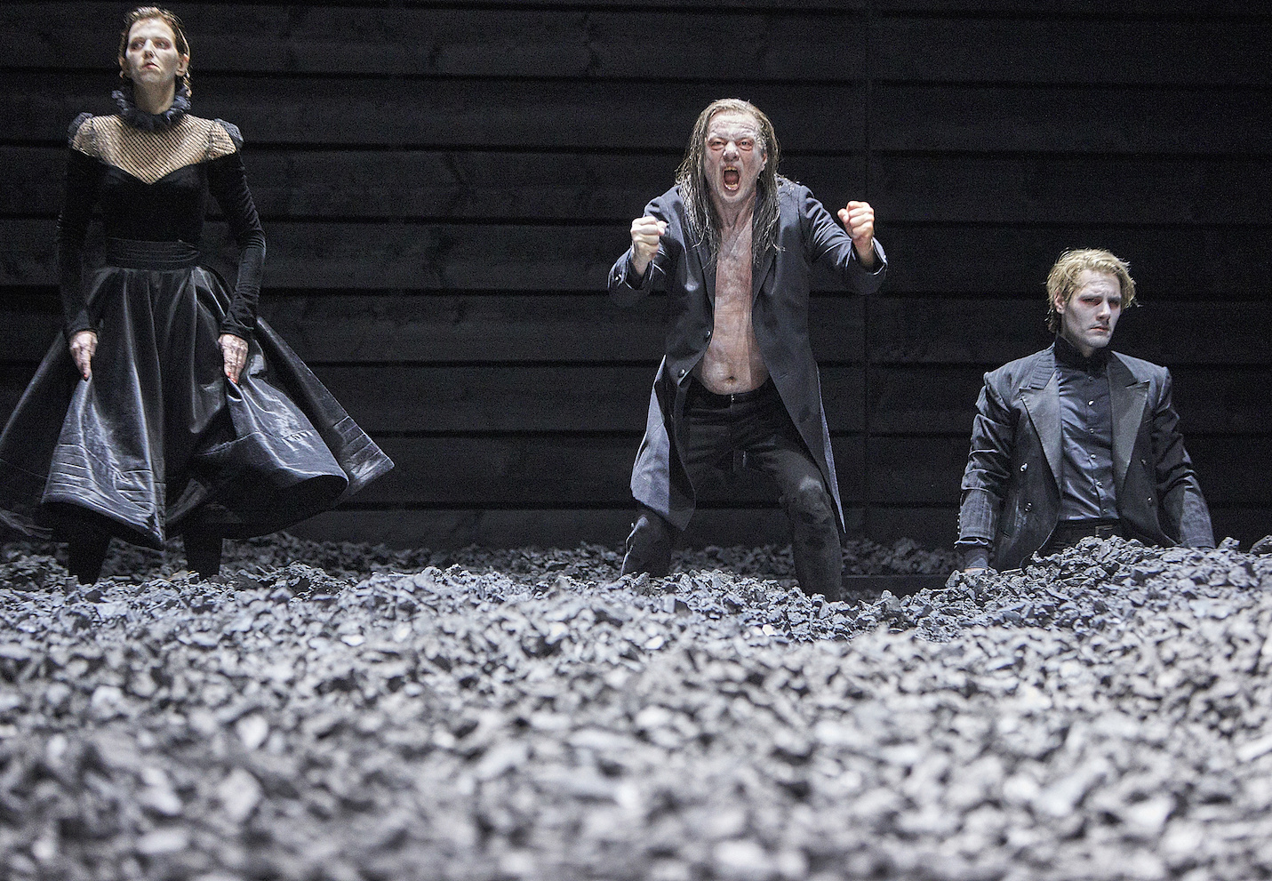 Es sind finstere Zeiten, daran lassen Thalheimer und sein Bühnenbildner Olaf Altmann keinen Zweifel. Kein Licht, höchstens eine Minidosis diffuse Dämmerung injiziert der Lightdesigner Tobias Löffler anfangs in den klaustrophobisch schwarz verschalten Bühnenturm und zeichnet damit eine kaum wahrnehmbare Schraffur an die Seitenwand. Der türenlose Tower zieht den Blick nach oben – irgendwas muss doch noch da sein in dieser Leere, durch die von Beginn an unheilvoll Bert Wredes dunkler Elektrosound kriecht. Doch so etwas wie ein goldener Hoffnungsstreif wird sich an diesem Abend erst zeigen, wenn nach gut zweieinhalb Stunden zielstrebigen Gemetzels endlich auch der Titelheld blutig verendet ist.