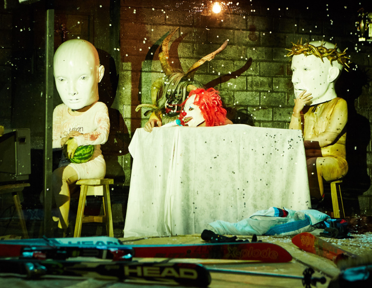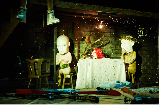 Sinnlich, im Sinne von bodenständig (und also konsequent), beginnt auch Bachmanns Inszenierung im Kölner Depot 2. Es ist eine Ballermann-Stimmung, in die man hier treffsicher geworfen wird; nur eben – von wegen «Schnee Weiß» – auf Österreichisch-Winterlich: Halsbrecherisch und in stilechter Skikleidung, die zu vorgerückter Stunde auch mal unansehnlichen Nackt-Fatsuits weicht, werfen sich die Schauspielerinnen und Schauspieler Simon Kirsch, Lola Klamroth, Peter Knaack, Nikolay Sidorenko und Sabine Waibel eingangs von einem Kunst-Schneehang herunter. Jana Findeklee und Joki Tewes (Bühne und Kostüme) haben in puncto Bühne und Kostüme sozusagen ganze Immersionsarbeit geleistet.