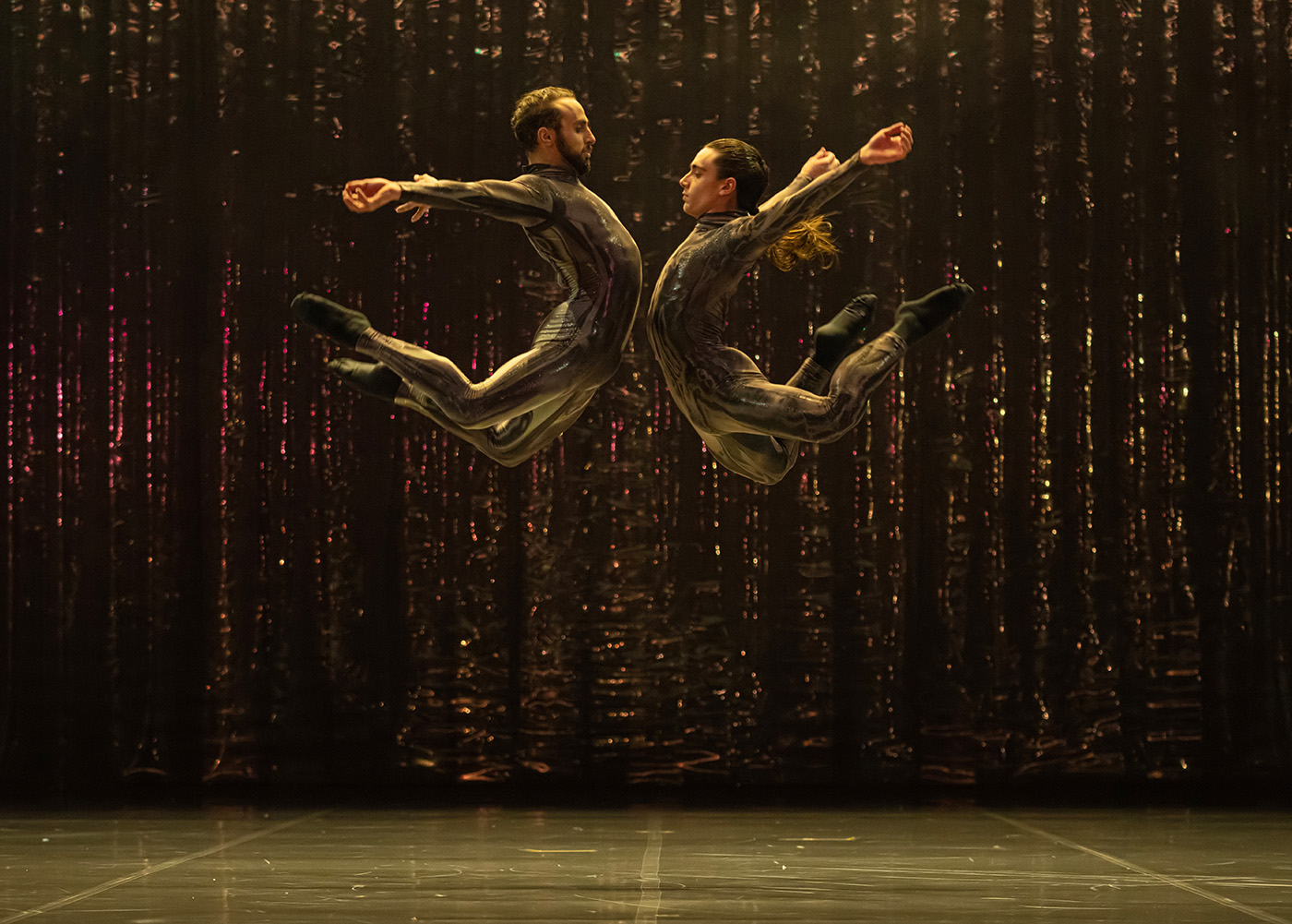 Zu all diesen Eindrücken gesellt sich noch das Spiel mit Horror und Trompe-l’œil: Nach dem Albtraum bleibt nur ein Tänzerkörper im Gegenlicht als Schatten auf der Bühne übrig. Er wirkt seltsam monströs, mit verschobenen Proportionen, irgendetwas stimmt hier nicht – und dann die Überraschung: Aus dem Körper löst sich wie von Geisterhand ein zweiter heraus, der dahinter verborgen war.