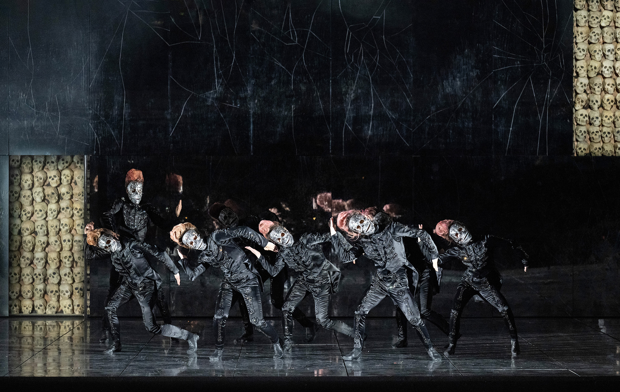 Überall lauert der Tod, nicht nur in der Musik. Wenn die drei fiesen, dabei höchst eloquenten Schergen der Macht – Ping (Germán Olvera), Pang (Ya-Chung Huan) und Pong (Lucas van Lierop) – im zweiten Akt von ihrer Sehnsucht singen, von der Heimat, die sie hinter sich lassen mussten, dann halten sie alle drei Totenköpfe in die Luft, die für sie singen. Die «Minister» selbst sind längst Teil des Unterdrückungsapparats geworden, der alles niedermäht, was nicht systemkonform ist. Das Totenkopfbild ist brillant, weil es nicht dem Naheliegenden verfällt, sprich: eine harsche Kritik am autoritären Regime des heutigen China formuliert, sondern vielmehr die Metapher sucht. Masse und Macht definiert sich nicht durch lokale Zuschreibung, sie ist menschengemacht, allerorten in der wüsten, wilden, weiten Welt. Jenes China, das in der Oper evoziert (und illustriert) wird, ist nur ein Beispiel von vielen. Ein Signifikat.