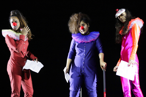 Die maximale kulturelle Differenz vermutlich, und sie wird von der ersten Sekunde an thematisiert. Während Heiner Müllers Sätze «Ich stand an der Küste und redete mit der Brandung BLABLA» gegen das Brandungsrauschen aus dem Off über die schwarze Gaze flimmern, die die Bühne in Rampe und geisterhaftes Hinten teilt, performen die sieben Schauspieler ein stummes Spiel in Clownsmasken und schrillen Einteilern (Bühne und Kostüme: Evi Bauer). Aus Müllers «Zweitem Clown im Kommunistischen Frühling» ist der «Dritte Clown im Arabischen Frühling» geworden. Traurige Clowns, die wacker anspielen gegen Müllers eisige Grabgesänge auf den Untergang des real existierenden Sozialismus, das Ende einer Revolution.