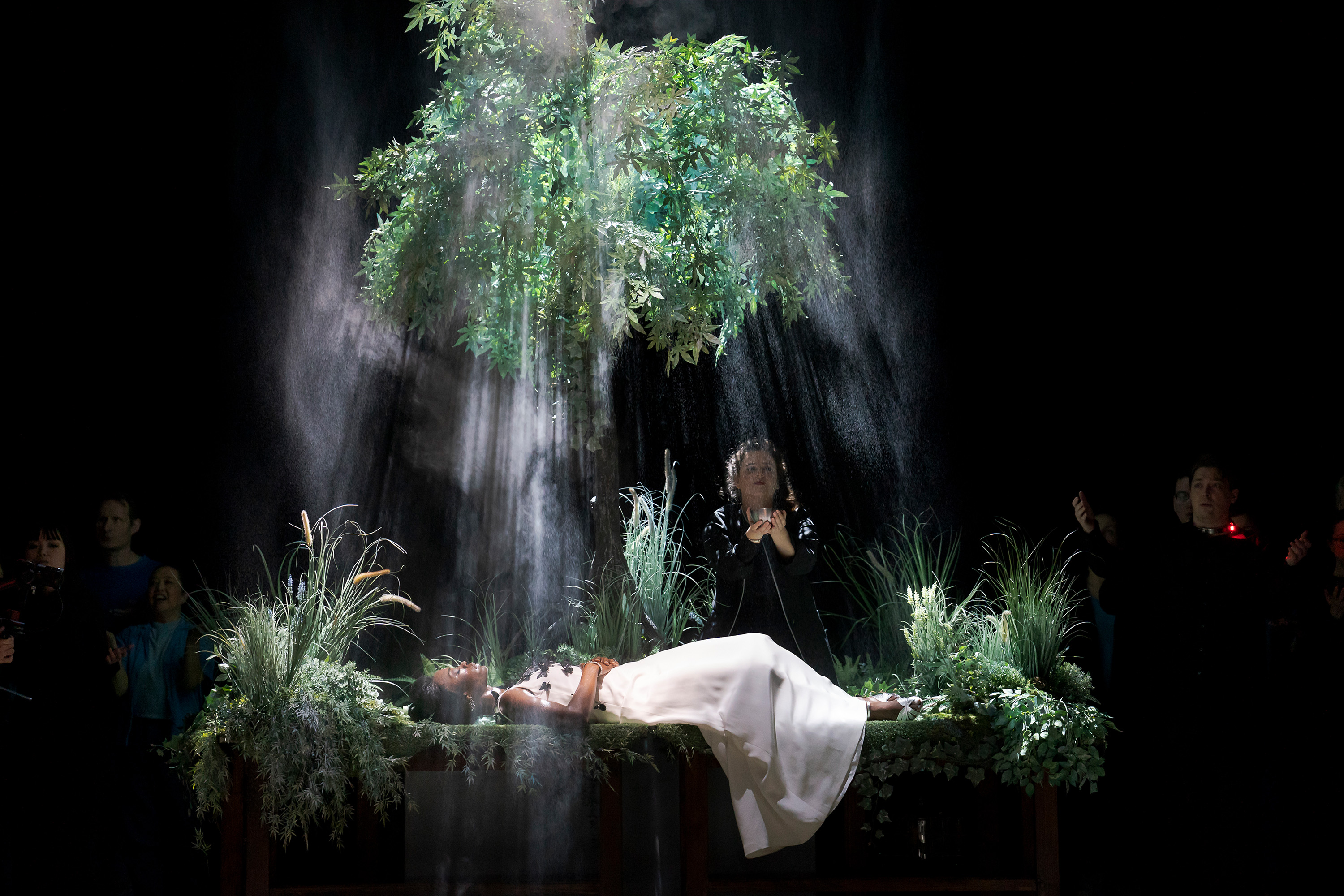 Dies liegt auf Fabien Teignés raffiniert erdachter Bühne auf einem erhöhten Level und bietet gleich zu Beginn den regierungstreuen, von Kostümbildnerin Yashi in steril-schickes Weiß gekleideten Babyloniern die Gelegenheit, das feindliche Heer zu verspotten, das vor der Stadtmauer ausharrt in der Wüste, jenem «Ort, der kein Ort ist» (Maurice Blanchot). Die Einrichtung des Palastes ist zweckmäßig. Ein Doppelbett für die Wollust, eine Chaiselongue für die Entspannung «danach», ein Schreibtisch für dringende Staatsgeschäfte und natürlich ein großer TV-Screen, auf dem das von Andreas Deinert und Georg Eisnecker in den digitalen Blick genommene Geschehen parallel in die Welt gesendet wird. Für den Betrachter resultiert daraus die nicht eben geringe Herausforderung, seine Wahrnehmung zwischen der gespielten Bühnenrealität und ihrer technischen Reproduktion zu teilen. Signeyrole hat dieses Prinzip schon mehrmals angewandt: in Strasbourg, bei «Samson et Dalila», in ihrer Dortmunder «Frédégonde»-Arbeit und zuletzt in Berlin, bei «Negar». Sie rekurriert damit auf die Welt, wie sie ist: eine Welt voller Bilder (die uns überschwemmen und uns dazu zwingen, den Fokus ständig aufzuweichen), eine gleichermaßen ungefähre wie flüchtige Welt, in der diejenigen, die im Besitz der Macht sind, diejenigen, die es nicht sind, nach Belieben terrorisieren.