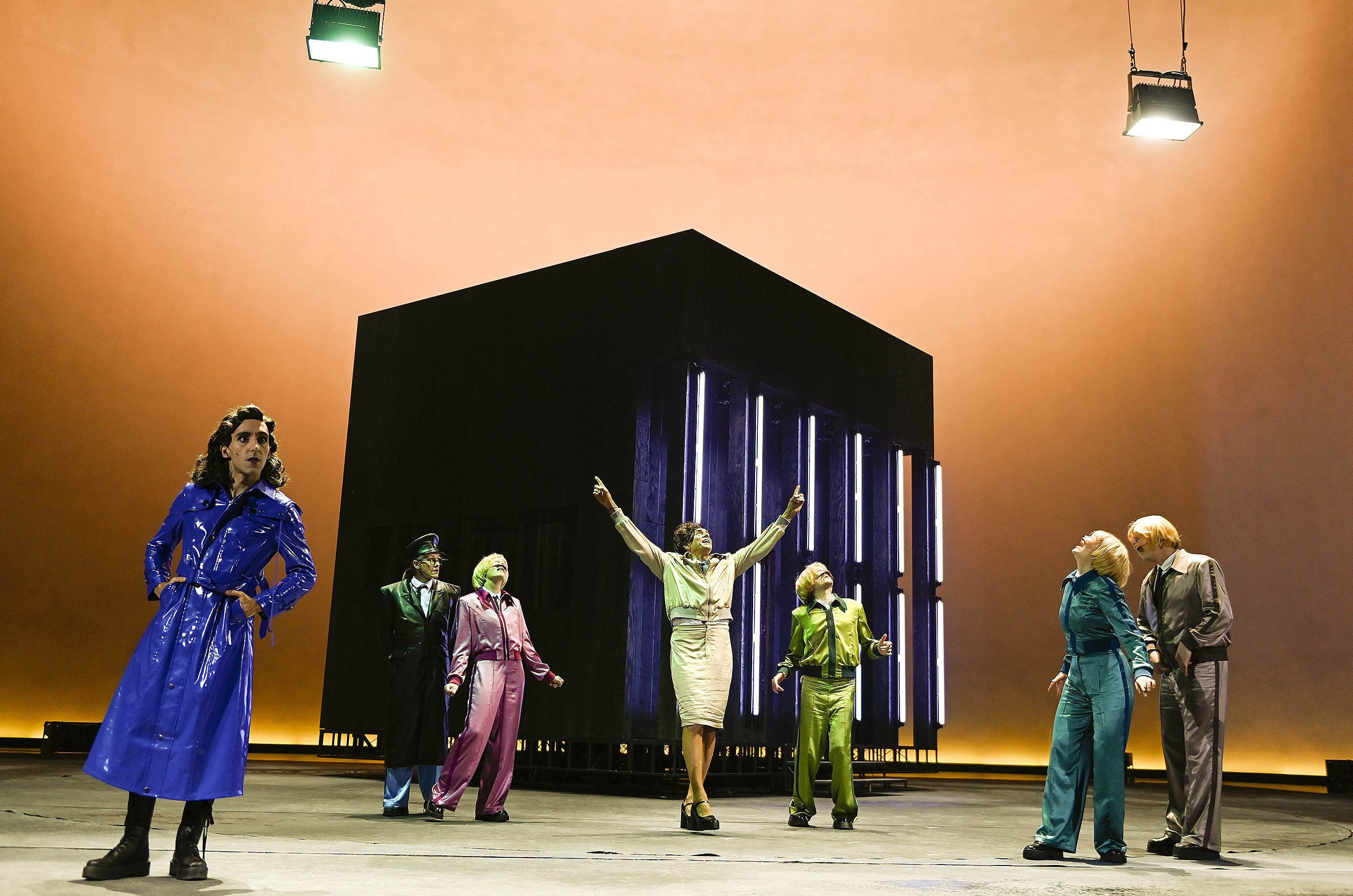 In Dresden nimmt Claudia Bauer nun einen neuen Anlauf. Die Eingangsszene, in der sich Nadja Stübiger als Kommissar Xaver März mit Sohn Paule und vier weiteren Blondschöpfen in bonbonfarbenen Trainingsanzügen Speer-City zeigen lässt, vermittelt tatsächlich einiges vom Bombast und Zynismus des fiktiven Siegerstaats – obwohl de facto nichts zu sehen ist. Nur einen schwarzen, auf Metallgestänge fixierten Holzkubus hat Andreas Auerbach für die Bühne entworfen. Im Lauf der Inszenierung offenbaren Videoprojektionen gelegentlich Blicke aus seinem undurchdringlichen Inneren; dann schieben sich Baumstämme oder eine teutsche Küchenzeile ins Bild. Doch im großen Ganzen: Black Box.
