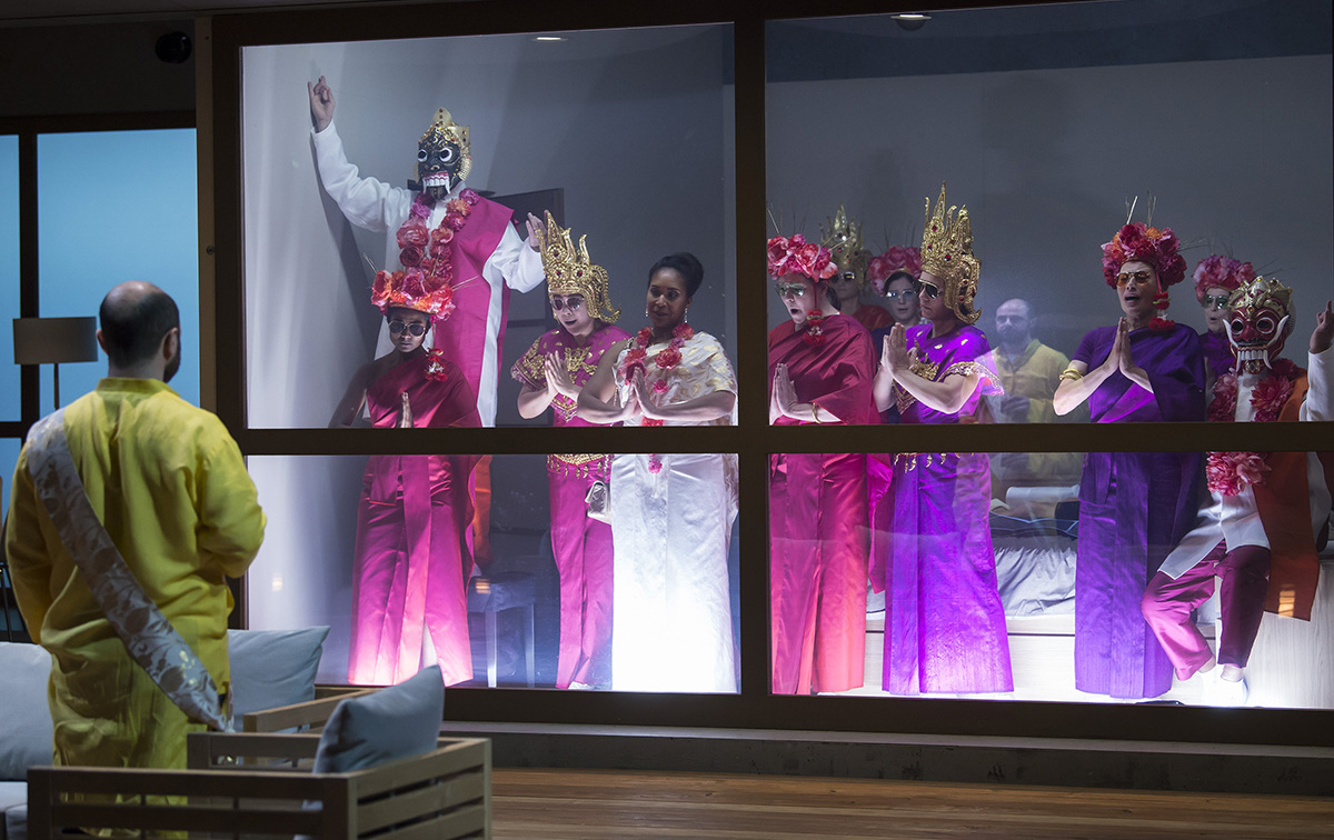 Dadurch erfahren die Figuren eine noch stärkere Charakterisierung oder Aufwertung, etwa Kate Pinkerton oder Konsul Sharpless, allen voran aber Lieutenant B. F. Pinkerton, dessen post-koloniales Gebaren dem moderner westlicher Reisender gar nicht unähnlich ist – der Sextourismus von heute unterscheidet sich von dem um 1900 allenfalls durch das verbesserte technische Equipment … Die Basler Inszenierung scheint von dieser Grundüberlegung auszugehen. Und weil Geld zu keiner Zeit gestunken hat, machen alle mit. Auch die Einheimischen, die den Yankees eine fernöstliche Hollywood-Hochzeit vorgaukeln als Mix aus balinesischen und thailändischen Ritualen (Kostüme: Olga Shaishmelashvili). Alles Japan oder was? Der an landestypischer Kultur denkbar desinteressierte Trottel mit dem Smartphone hat harte Dollars – nur das zählt.