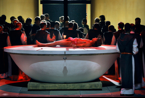 Nicht nur gedanklich geht es unscharf zu. Die Personenführung bleibt hausbacken. An zentraler Stelle im zweiten Akt, wenn Kundry von ihrer Begegnung mit dem Heiland berichtet und Parsifal einweiht in ein Geflecht aus Schuldverstrickung und Erlösungsbegehren, steht die Sängerin allein auf der Bühne, adressiert hilflos das Publikum. Der Grund zeigt sich wenig später: Parsifal musste sich einfach umziehen. Neckisch war er in einem orientalischen Bad untergetaucht, hatte vom weiblichen Verführungspersonal Frotteehandtücher bekommen, nun steht er wieder im Tarnanzug vor uns. Die entscheidende dialogische Sequenz als Arien-Verschnitt, der davor liegende Erschütterungsausbruch des Titelhelden als szenisches Terzett, bei dem sich Amfortas (oder ist es ein anderer Ritter?) zwischen Kundrys Schenkeln vergnügen kann: Das muss einem erstmal einfallen. Im dritten Akt dann die Dreifaltigkeit abgestandenen Regietheaters: Rollstuhl, Kühlschrank und Mülltonne. Phallusartig ragt ein Gummibaum herein. Zum Karfreitagszauber tummeln sich nackte Evas unter einer Regendusche. Warum eigentlich keine Männer? Der Schluss verpufft kläglich zwischen Realismus und Möchtegern-Welttheater. Vorsorglich wird im Programmheft der Dalai Lama zitiert: Manchmal sei es besser, wenn wir keine Religion hätten. Nun entsorgen Männer und Frauen religiöse Symbole verschiedenster Provenienz im Sarg des Titurel. Die Lichter im Zuschauerraum gehen an. Wir sind gemeint. Ach so? Ach nee.