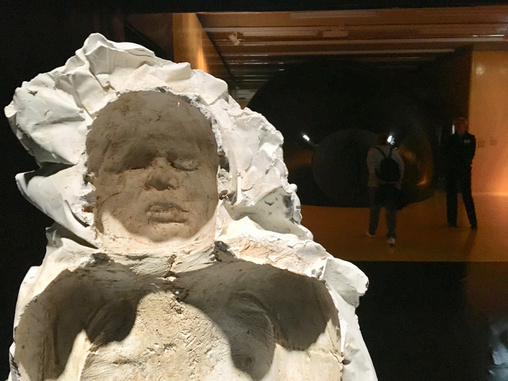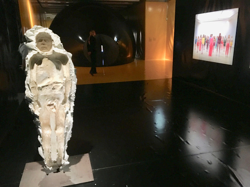 Der Abguss einer Leiche von Teres Margolles vor einer Arbeit von Vanessa Beecroft. Im Hintergrund der Darmausgang des Bandwurms, in dem sich eine Arbeit von Sturtevant nach Paul McCarthy befindet, die nicht für Kinderaugen geeignet sei