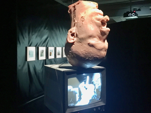 Bruce Naumans Arbeit „Perfect Balance“ von 1989 zeigt einen abgeschlagenen Kopf mit raushängender Zunge über dem Video-Bild eines Stinkefingers und thematisiert damit die hämische Reaktion auf Gewalt in der Gesellschaft