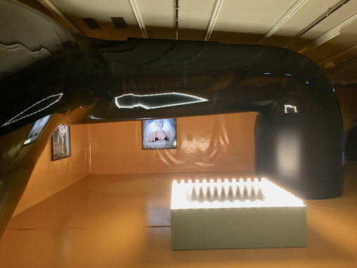 Den verschlungenen Gang durch die MMK-Dependance im TaunusTurm hat Mondtag deshalb mit gelber Lastwagenfolie dort ausgeschlagen, wo man sich im Darm der Sängerin befindet. Begleitet wird der Innereienspaziergang von einem schwarzen Riesenschlauch als Bandwurm, in dem ebenfalls (dann doppelt verdaute) Kunstwerke im Hohlraum leuchten. Zur Hälfte der Ausstellung wechselt man in schwarzes Ambiente und befindet sich im Inneren des Mitessers, um fortan in morbider Finsternis zu wandeln. Dazu sprechen Schauspieler des Thalia Theaters unter Schallduschen Texte von Thomaspeter Goergen, dem Dramaturgen von Ersan Mondtags Durchbruch-Inszenierung „Tyrannis“ in Kassel.