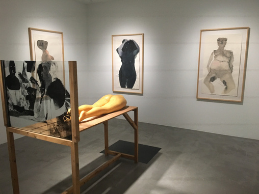 Rosemarie Trockels „Frau ohne Unterleib“ wird umrahmt von Marlene Dumas Aquarell-Porträts unheimlicher Frauenkörper