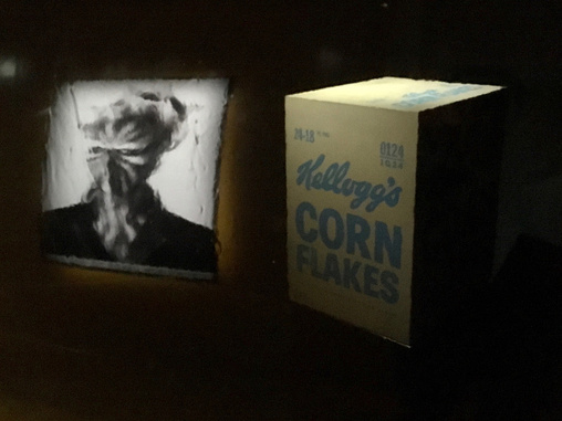 Andy Warhols Kelloggs-Box im Inneren des Bandwurms, auf dessen schwarzglänzender Haut sich das Motiv zum Ausstellungsmotto spiegelt: die Maske zu Will Benedicts Video „I am a Problem“, die den Titel trägt „Comparison leads to Violence“ (Vergleichen führt zu Gewalt).