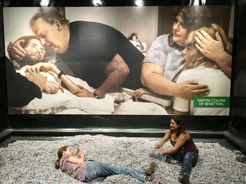Der zweite Abdruck einer obduzierten Leiche steht vor der berühmten Benetton-Reklame von Oliviero Toscani mit dem an AIDS sterbenden AIDS-Aktivisten David Kirby