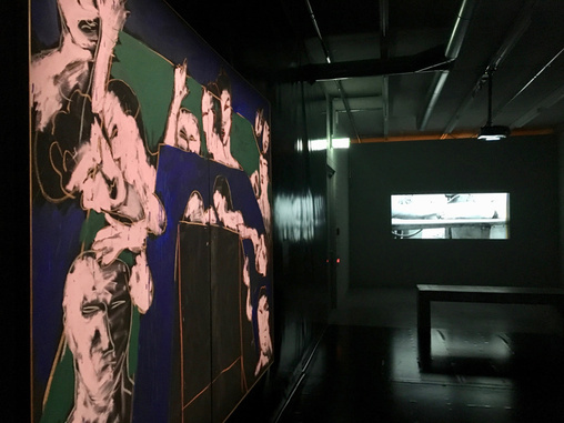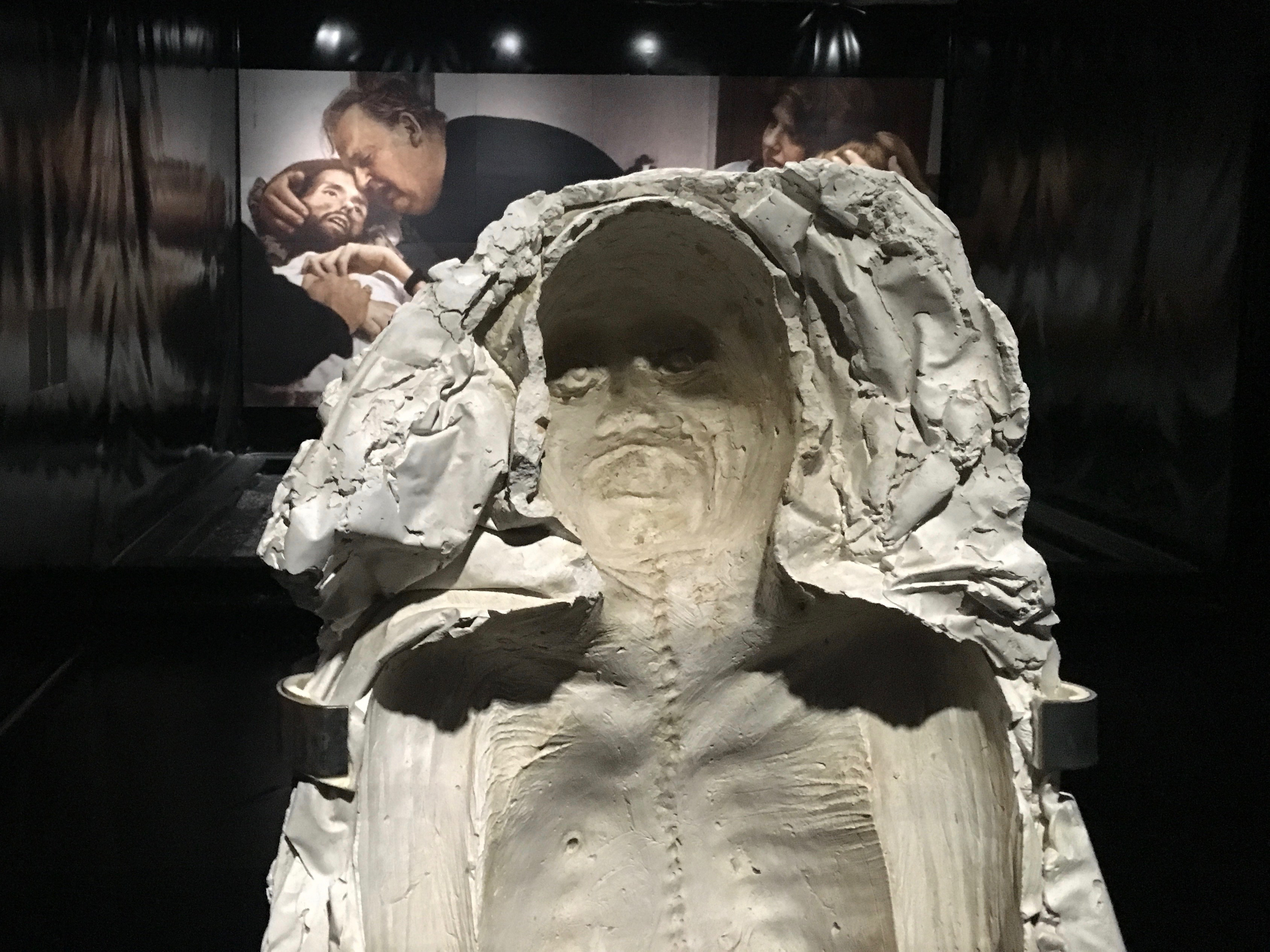 Ergänzt um lange Wandtexte, die man bei diesen Lichtverhältnissen nur lesen kann, wenn man sein Handyakku mit der Taschenlampenfunktion verbraucht, ist der Input dieser besonderen Inszenierung natürlich viel zu viel. Vor allem die literarischen Phantasien aus den Lautsprechern, die kompliziert erfundene Monologe und Dialoge der ausgestellten Künstler zu Gott, Körper und Tod vortragen, sind nicht wirklich in Zusammenhang mit der Kunst zu bringen.