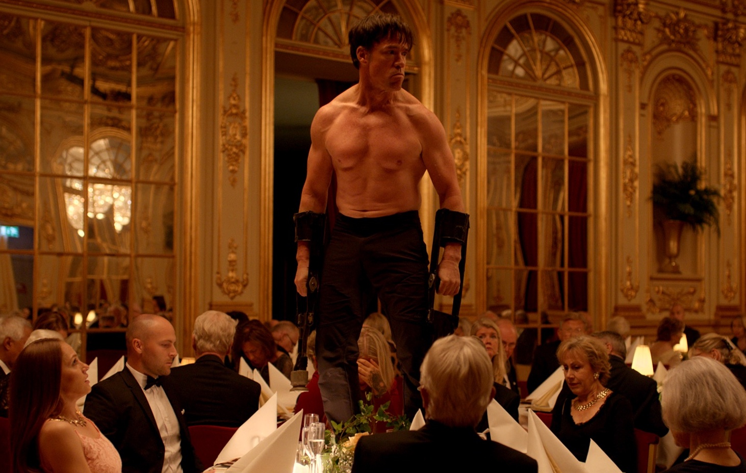 Überhaupt klaffen in der konfliktbefriedeten Kunstwelt überall kleine Lücken, durch die explosiv Druck entweicht. Eher harmlos ist es noch, wenn der seine Menüfolge vortragende Koch die Gäste anbrüllt, weil keiner ihm zuhört. Drastisch spitzt sich die Lage zu, als beim Sponsorendinner ein Performer als «Affenmensch» (in einem Video ist er Teil der Ausstellung) auch leibhaftig über die eingedeckten Tische rast und schließlich fast eine junge Frau vergewaltigt. Hier ist der Rahmen «Kunst» so wirksam (oder das «Animalische» so einschüchternd), dass erst in letzter Sekunde Gäste eingreifen – wobei sich ausgerechnet die älteren Männer zutrauen, handgreiflich zu werden.