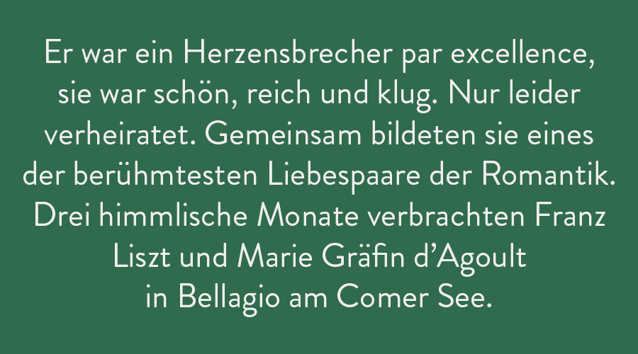 Wenn Sie die Geschichte zweier glücklicher Liebender schreiben, so wählen Sie als Schauplatz die Ufer des Comer Sees! Ich kenne sonst keine so offensichtlich vom Himmel gesegnete Landschaft, keine, in der der Zauber eines liebeerfüllten Lebens natürlicher erscheinen könnte.» Dies schrieb Franz Liszt am 20. September 1837 in Bellagio, der «Perle des Comer Sees», wie der Ort sich heute stolz nennt. Er war nicht der erste, der dem Zauber des von hohen Gipfeln umfangenen Wassers verfiel. Schon Plinius der Jüngere erbaute sich dort, wo die drei Arme des Y-förmigen Sees sich treffen, auf jenem Vorgebirge, das einen atemberaubenden Blick in den nördlich auf schneebedeckte 2000er zuführenden Seearm gewährt, seine «Villa Tragoedia». Shelley fand das Panorama schöner als alles, was er bislang gesehen; der weitgereiste Stendhal schwärmte nicht minder; und Flaubert wollte in dieser «Shakespeare’schen Landschaft» am liebsten gleich tot umfallen («on voudrait vivre ici et y mourir»).