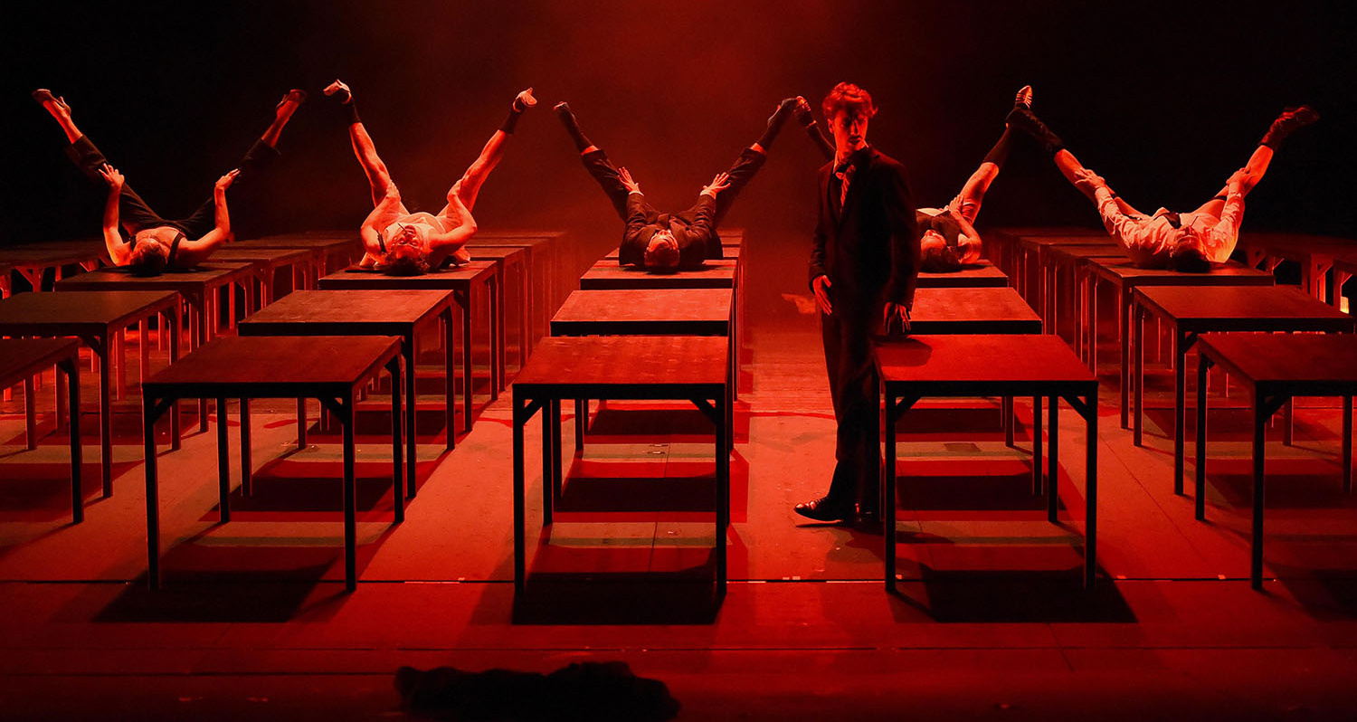 Dementsprechend liegt die nur mit Tischen bestückte große Bühne von Valentin Baumeister meist im Halbdunkeln oder Dunkeln. Die experimentellen Klänge von Sounddesigner Fiete Wachholtz tauchen alles in atmosphärische Fremdheit. Faszinierend ist der Strom traumgleicher, die Realität bis zur Kenntlichkeit verfremdender Körper-Bilder und Situationen, in den man durch die ausdruckstarke Gruppe hineingesogen wird: So sieht sich der frisch angeklagte K (bemerkenswert auch hier der stirnlockige Raimund Widra, hohlwangig und mit fahrigen Gesten) einem endlosen Meer von Tischen gegenüber, an denen graue Anzugträger undurchschaubare Tätigkeiten verrichten.