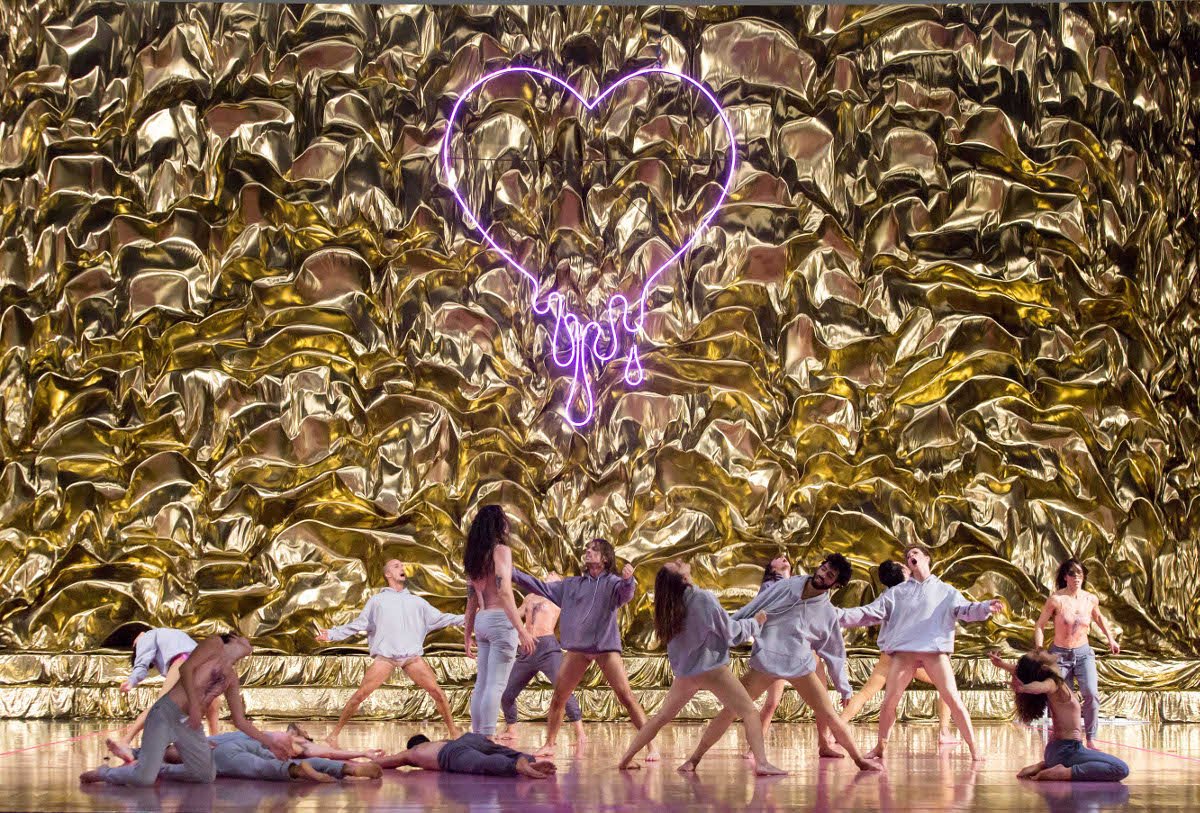 Die Bühne bleibt denn auch leer bis auf einen goldenen Schleier, der sich erst von ein paar Treppenstufen hebt, um später wie ein Leichentuch alles unter sich zu begraben. Es dauert seine Zeit, bis Serge Prokofjew den Ton angibt und sich das gesamte Ensemble in eine Choreografie hineinfindet, die sich weniger narrativ als vielmehr assoziativ mit den Archetypen der Shakespeare-Vorlage auseinandersetzt. All das geschieht nicht ohne Augenzwinkern und schon gar nicht ohne Stimme. Aufstöhnend stürzen sich die Tänzer und Tänzerinnen in einen Kampf, bei dem das Kräftemessen keinen erkennbaren Unterschied mehr macht zwischen Montagues und Capulets, zwischen Männern und Frauen: ein Catch-as-catch-can nach allen Regeln der Kunst, bei dem am Ende auch nicht die Cheerleaders mit ihren obligaten Pompons fehlen dürfen. Es braucht da schon ein paar Zwischenrufe, damit im choreografierten Chaos die eigentliche Geschichte nicht gänzlich verloren geht. Aber selbst dann wird nicht wirklich ein Handlungsfaden aufgerollt, sondern werden eher Liebe und Leidenschaft in einen orgiastischen Dauerzustand versetzt, den auch ein tränendes Neon-Herz kaum konterkarieren kann.